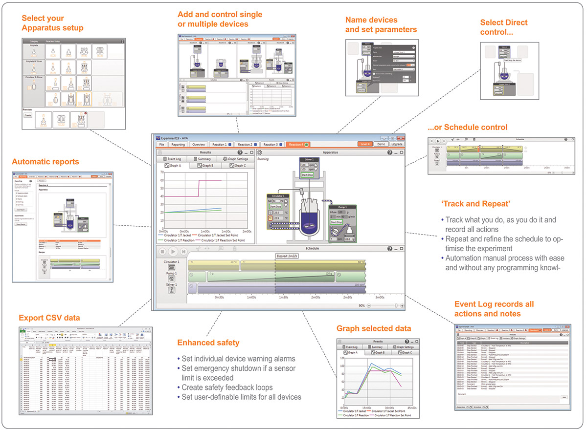 Radleysov programski paket AVA omogoča avtomatizacijo kemijskih procesov, ki so povezani z mešanjem, gretjem in hlajenjem. Paket je zasnovan tako, da poenostavi eksperimente, izboljša natančnost podatkov in poveča izkoristek reakcij. Z njim pridobite popolno avtomatizacijo, varnejšo kemijo, fleksibilnost in zaradi boljše produktivnosti tudi velike prihranke. Na voljo so štiri različice programskega paketa AVA. Od osnovne, ki kontrolira reakcije na magnetnem mešalu, do različice, ki popolnoma avtomatizira procese v kemijskih reaktorjih.