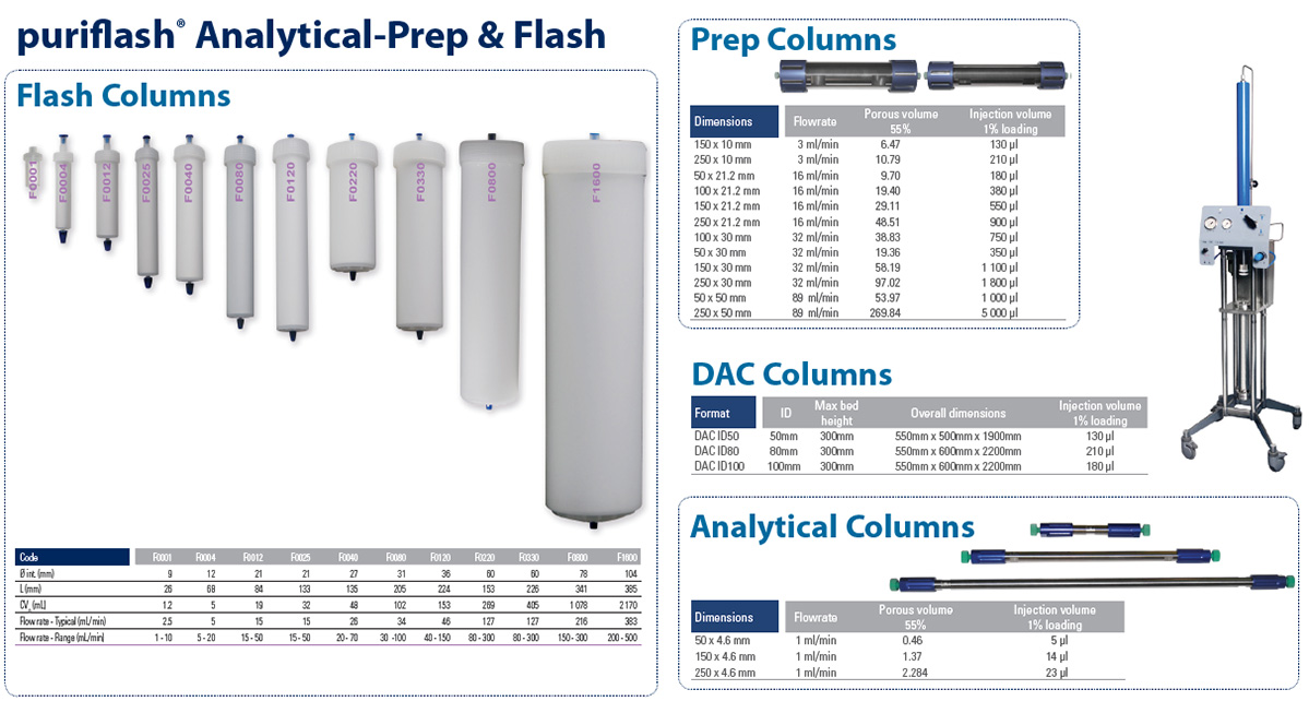 Interchim ima v svoji ponudbi preko 50 različnih stacionarnih faz, ki pripomorejo do optimalnih ločb. Najmanjši format kolon je F001, v katerem je, odvisno od tipa stacionarne faze, približno 1 g polnila. Največji format je F1600 ali več za specifične aplikacije.